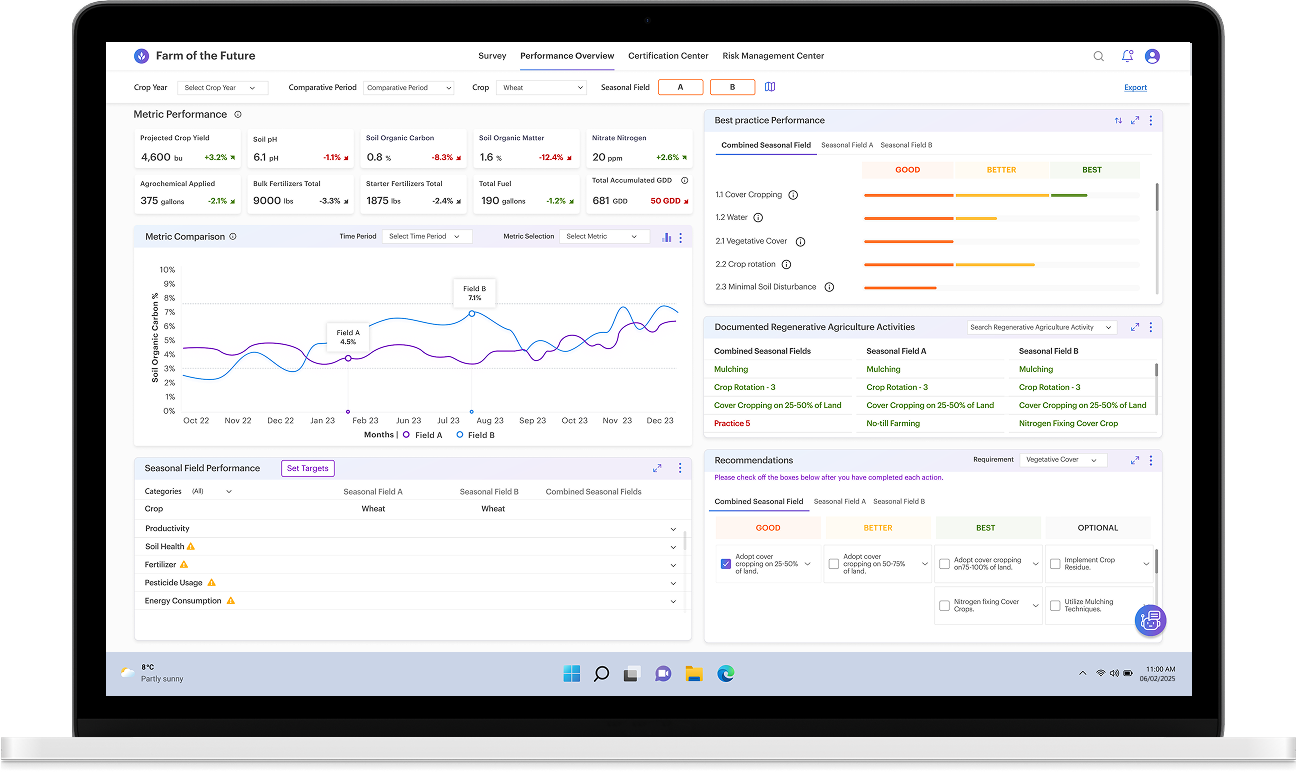 Designed as a unified digital platform built on Azure that brings fragmented agricultural data into a single, cohesive user experience. The product prioritizes data integration and clarity, allowing farmers to easily monitor sustainability efforts without juggling multiple tools.